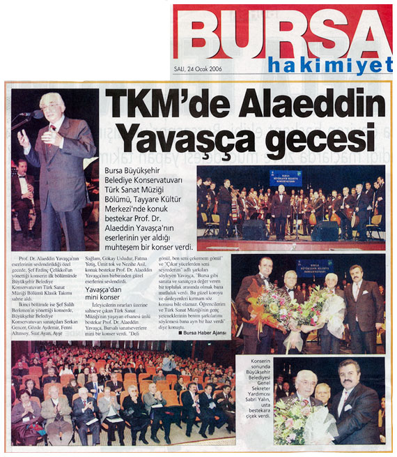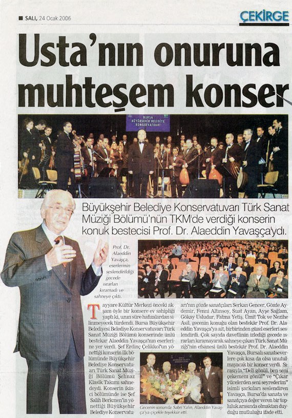 Bursa Büyükşehir Belediye Konservatuarı Türk Sanat Müziği Bölümü, Tayyare Kültür Merkezi’nde konuk bestekar Prof. Dr. Alaeddin Yavaşca’nın eserlerinin yer aldığı bir konser verdi. Şef Erdinç Çelikkol yönettiği konserin ilk bölümünde Büyükşehir Belediye Konservatuarı Türk Sanat Müziği Bölümü Şehnaz Klasik Takımı sahne aldı. Konserin ikinci bölümünde ise Şef Salih Berkmen’in yönettiği konserde Büyükşehir Belediye Konservatuarının genç sanatçıları Serkan Gencer, Gözde Aydemir, Fenni Altınsoy, Suat Ayan, Ayşe Sağlam, Gökay Usludur, Fatma Yetiş, Ümit tok ve Nezihe Asil, konuk bestekar Prof. Dr. Alaeddin Yavaşca’nın birbirinden güzel eserlerini seslendirdi.